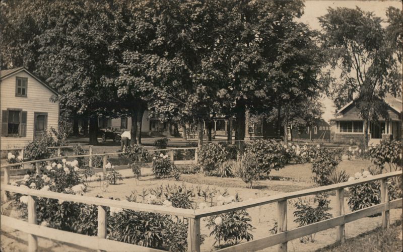 View of a fenced garden filled with peony bushes. Houses and large trees are visible in the background, along with a person near a cart.