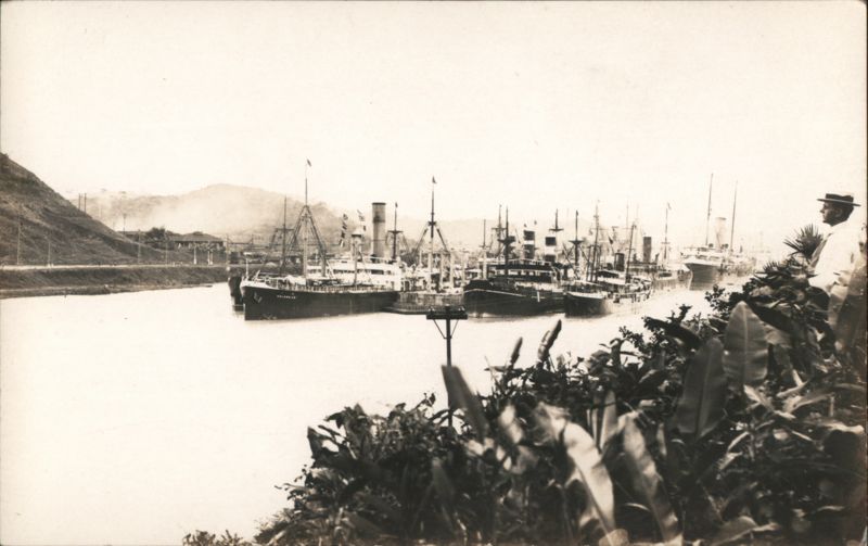 Several multi-funnel steamships are moored side-by-side along a waterway, possibly a canal or harbor. Lush tropical vegetation is in the foreground, and a man in a hat observes from the right bank. Hills are visible in the background.