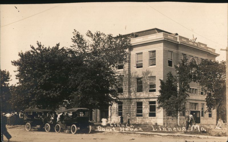 Exterior view of the Linn County Courthouse with several early automobiles parked in front.