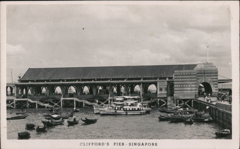 Waterfront view of Clifford's Pier with numerous boats, including sampans and a motor launch, docked or nearby.