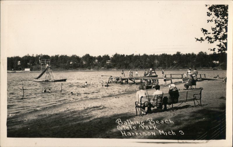 People swimming and relaxing at a lake beach with docks, a water slide, and a diving platform.