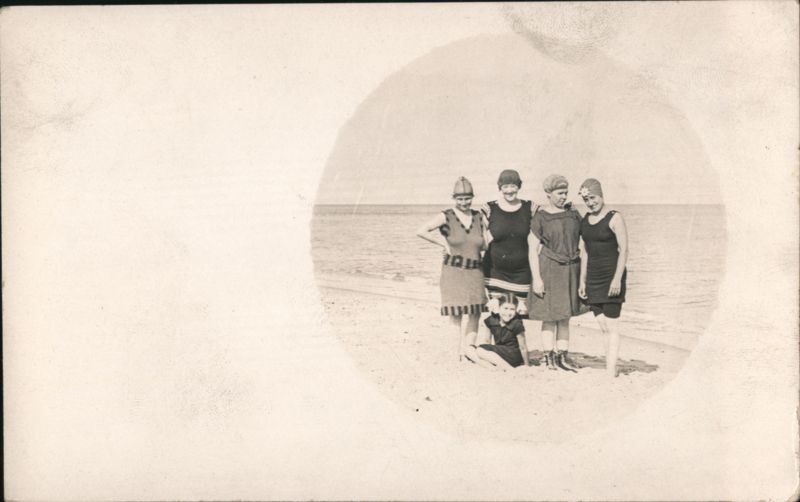 Four women and one child pose on a sandy beach near the water's edge, wearing early 20th-century style bathing suits and caps. The image has a circular vignette.