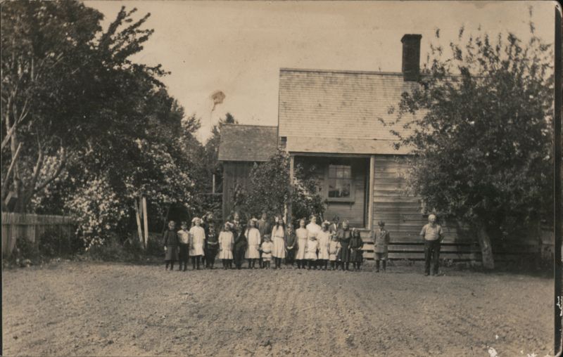 Group portrait of numerous children and a few adults standing in a dirt yard in front of a simple wooden building, possibly a rural schoolhouse.