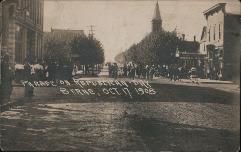 | Street view of a parade in Berne on October 17, 1908, identified as Republican Day. Spectators line the street, and participants march down the center. Buildings, including one with a sign for 'Birdsell Wagon', and trees line the street. A church steeple is visible in the distance. |