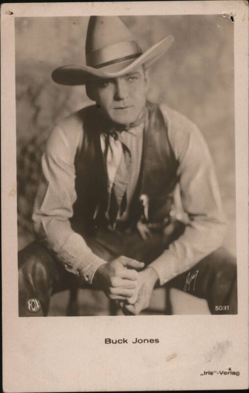 Portrait of actor Buck Jones in cowboy attire, including hat, vest, and bandana.