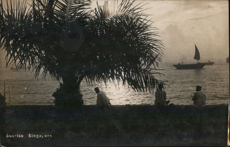 Three figures sit on a wall beneath a large palm tree, watching the sunrise over the water in Singapore harbor. Boats are visible in the distance.