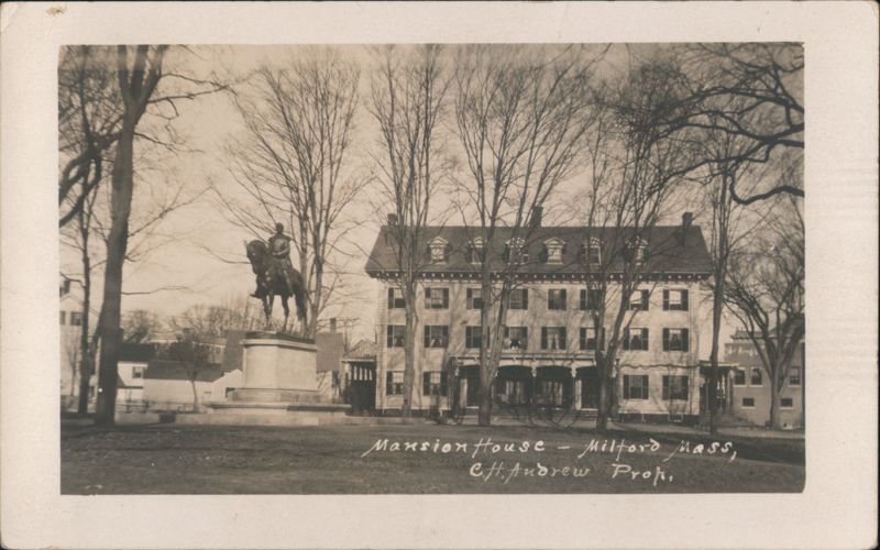 Front: Mansion House - Milford Mass, CHAndrew Prop, Back: 50 AAZOA = STAMP = HERE O A AZO A NAME AND ADDRESS HERE