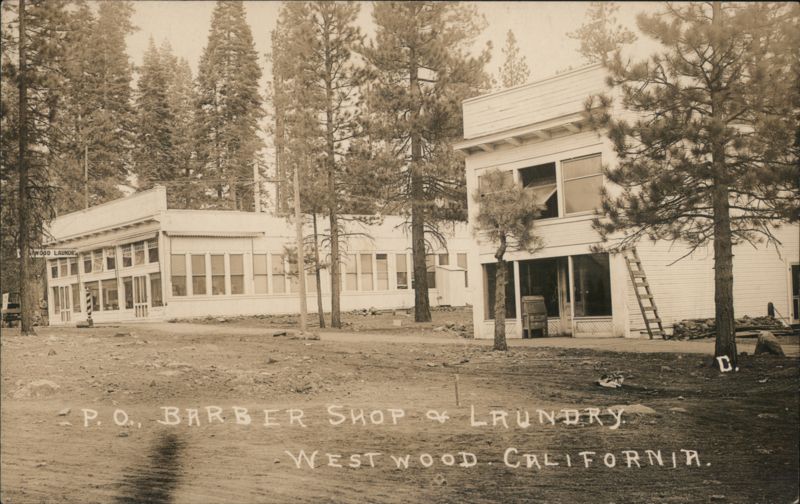 Front: TWOOD LAUNDR P. O., BARBER SHOP & LAUNDRY WEST WOOD CALIFORNIA. D. Back: AAZO A = STAMP = 0 HERE AAZOA NAME AND ADDRESS HERE