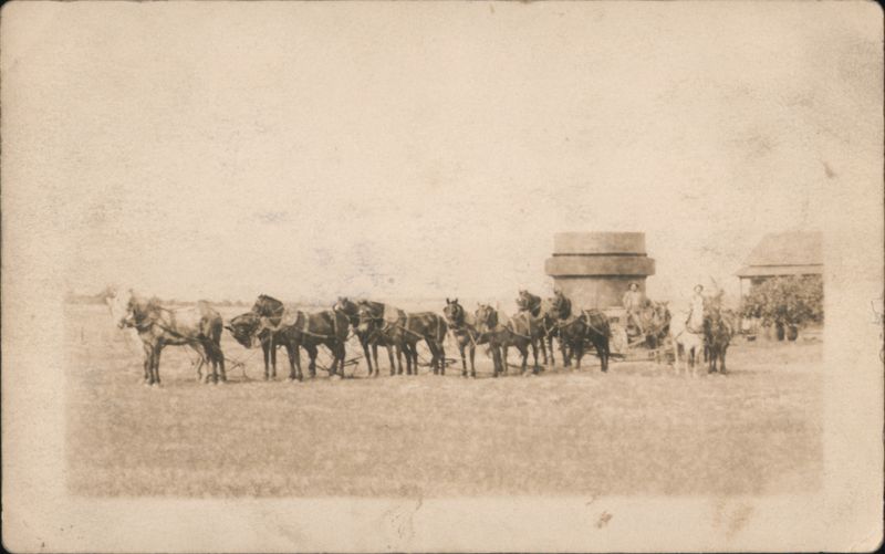A team of sixteen horses hitched in pairs pulls a large piece of farm machinery across a field. Several men are managing the team and equipment. A silo or water tower and a building are visible in the background.