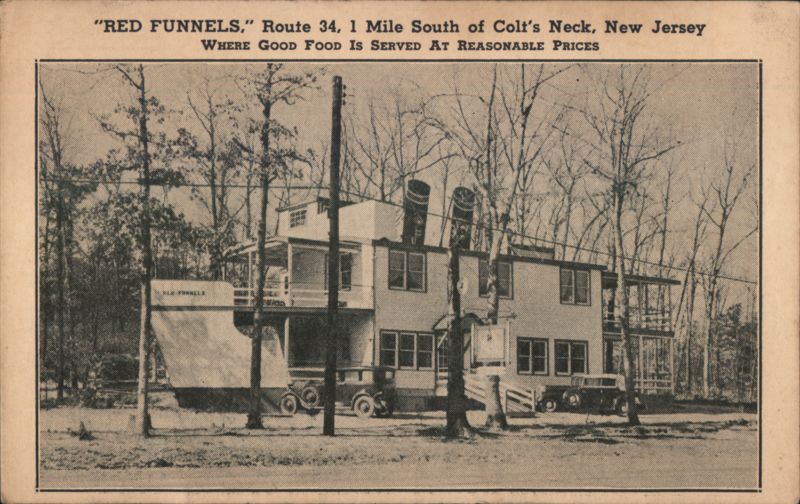 | Building shaped like a riverboat named "Red Funnels" located on Route 34, 1 mile south of Colt's Neck, New Jersey. Advertises "Good Food Served At Reasonable Prices". The back lists prices for dinners (65c to $1.00) and sandwiches (10c to 55c). |