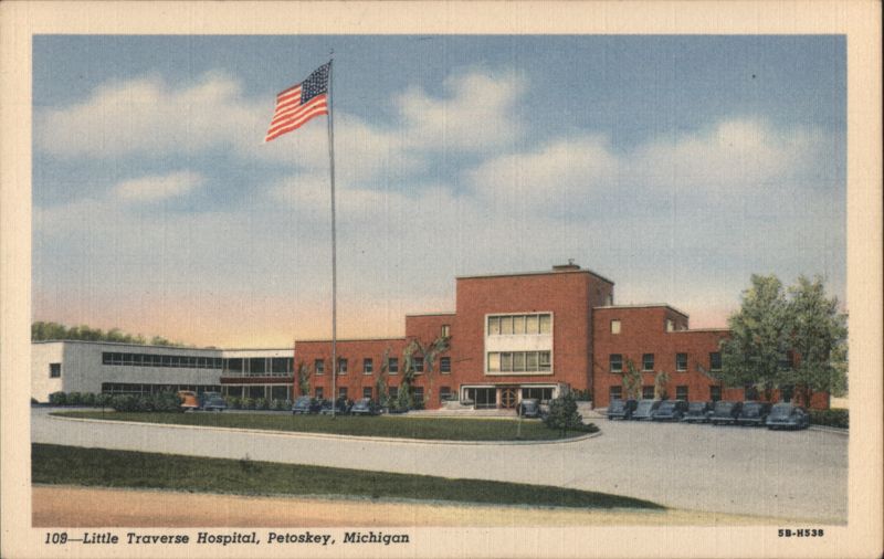 Front: 109-Little Traverse Hospital, Petoskey, Michigan 5B-H538 Back: MRS. A. G. COOK, PETOSKEY, MICH. GENUINE CURTEICH-CHICAGO "C.T. ART-COLORTONE" POST CARD (REG. U.S. PAT. OFF.) 254 PLACE