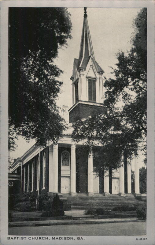 Front: BAPTIST CHURCH, MADISON, GA. G-287 Back: VIEW CLEAR MFD. BY WAYNE PAPER BOX & PRTG. CORP., FORT WAYNE, IND.