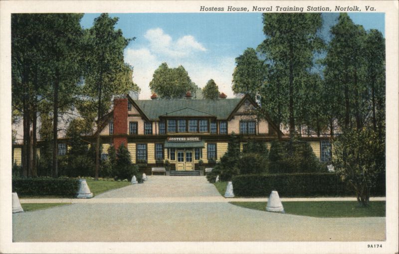 Front: HOSTESS HOUSE Hostess House, Naval Training Station, Norfolk, Va. 9A174 Back: THE HARRY P. CANN & BRO. CO., BALTIMORE, MD. GENUINE CURTEICH-CHICAGO C.T. AMERICAN ART'' POST CARD (REG.U.S. PAT.OFF.) HERE