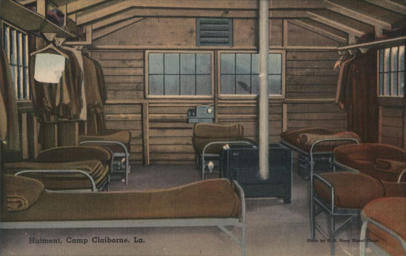 Front: Hutment, Camp Claiborne, La. Photo by U. S. Army Signal Corps Back: PUB. BY RED RIVER NEWS CO., ALEXANDRIA, LA. 74624 TICHNOR QUALITY VIEWS" REG. U.S. PAT, OFF. MADE ONLY BY TICHNOR BROS., INC., BOSTON, MASS. MADE IN U. S. A