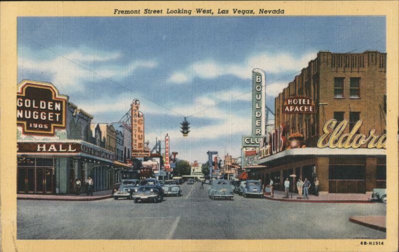 Front: GOLDEN NUGGET 1905 Fremont Street Looking West, Las Vegas, Nevada HALL WATERCO RENG LAS COME BAR CLU RA APACHE Eldor 6B-H2514 Back: DESERT SOUVENIR SUPPLY, BOULDER CITY, NEVADA "C.T.ART-COLORTONE REG. U.S. PAT. OFF. PLACE