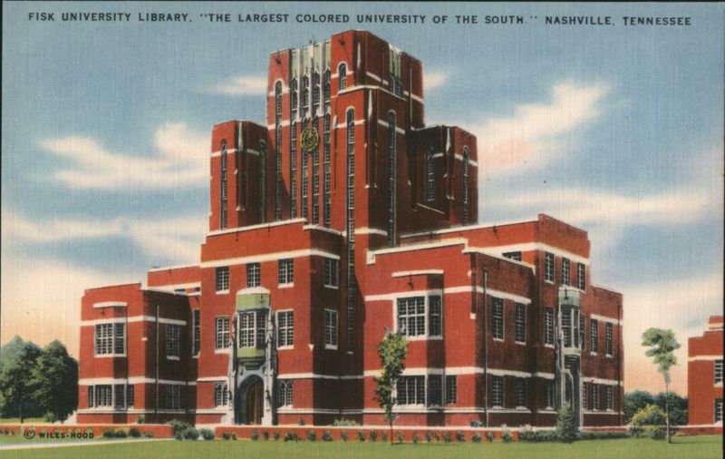 Front: FISK UNIVERSITY LIBRARY, THE LARGEST COLORED UNIVERSITY OF THE SOUTH.' NASHVILLE, TENNESSEE WILES-HOOD Back: SOLD BY NASHVILLE CARD CO.. NASHVILLE, TENN. 15,554 A "COLOURPICTURE" PUBLICATION, BOSTON 15, MASS., U.S.A. HERE