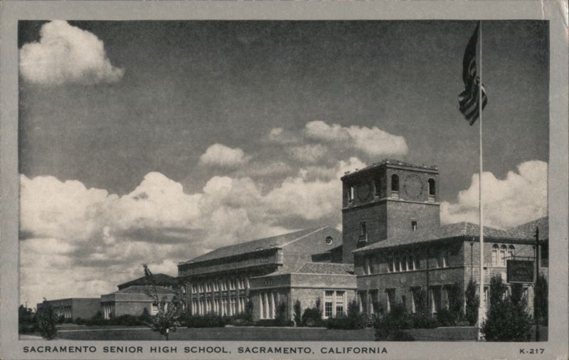 Front: SACRAMENTO SENIOR HIGH SCHOOL, SACRAMENTO, CALIFORNIA K-217 Back: VIEW CLEAR MFD. BY WAYNE PAPER BOX & PRTG. CORP., FORT WAYNE, IND.