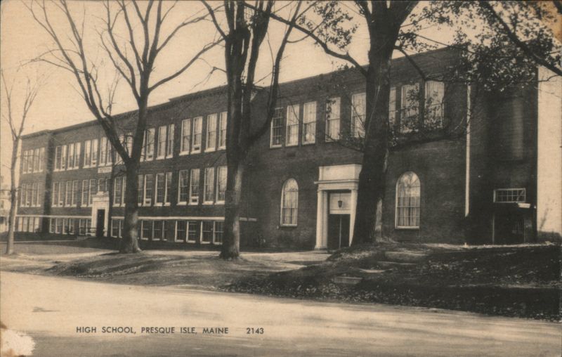 Front: ELE EEL LELE HIGH SCHOOL, PRESQUE ISLE, MAINE 2143 Back: AMERICAN ART POST CARD 60., BOSTON, MASS. HERE