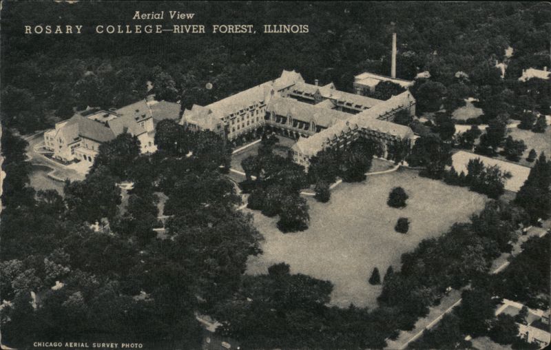 Front: Aerial View ROSARY COLLEGE RIVER FOREST, ILLINOIS CHICAGO AERIAL SURVEY PHOTO Back: 3C312 GENUINE CURTEICH-CHICAGO''C.T. PHOTO-COTE POST CARD (REG.U.S. PAT.OFF.) PLACE