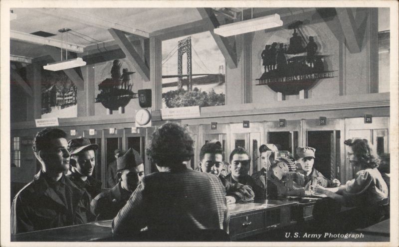 Soldiers line up at the counter of the New Jersey Bell Telephone Company Center at Camp Kilmer, a major staging area during WWII en route to Europe. Murals depicting the George Washington Bridge and military themes decorate the walls. |