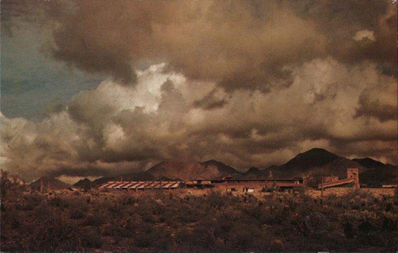 | Arizona office of Taliesin Associated Architects and campus of the Frank Lloyd Wright School of Architecture, established in 1932 by Mr. and Mrs. Frank Lloyd Wright. View shows the complex against a backdrop of mountains and dramatic clouds. |