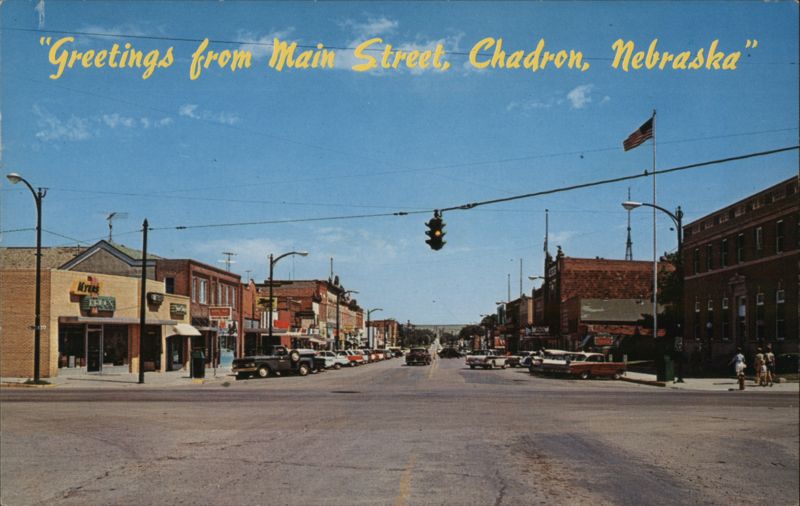 Front: "Greetings from Main Street, Chadron, Nebraska' Kris Back: "Greetings from Chadron, Nebraska Dunlap-Henline Distributors, North Platte, Nebraska Color by Gene McConnell S-53810-1 HERE