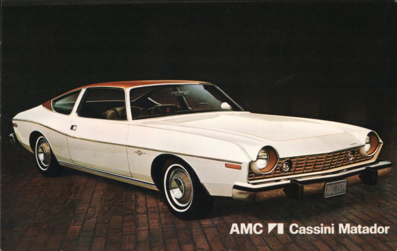 | White AMC Cassini Matador with a brown roof, parked on a wooden floor against a dark background. The license plate reads "AMC 1974". The reverse side features the text "AMC Matador BACKED BY THE BUYER PROTECTION PLAN" and the slogan "We Back Them Better Because We Build Them Better". |