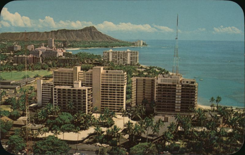 1003-Hawaiian Views, Dist. by Max Basker & Sons, Honolulu CURTEICHCOLOR Ⓡ 3-D NATURAL COLOR REPRODUCTION (REG. U. S. A. PAT. OFF.) PHOTO BY UNITED AIR LINES UNITED BIRDS-EYE VIEW OF WAIKIKI 4DK-863