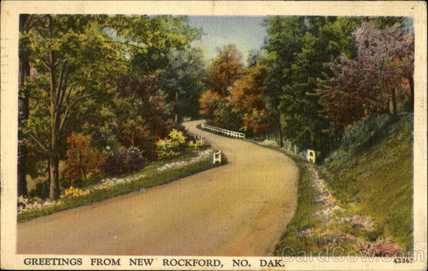 Front: GREETINGS FROM NEW ROCKFORD, NO. DAK. 43362 Back: Post CARB CEP 12.30 CEORGE WALATON 1789-1792 1969 1489-12 Des. risies Sane Tugio Derfreund Gedia & Potts IN 832-4th a ave San Diego hours Sie belangen sex Calis