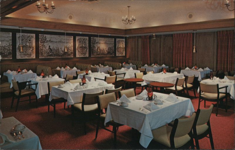 | Interior view of the Royal Pheasant Dining Room at the Sheridan Center Inn and Motor Lodge. The room features tables with white tablecloths, red carpeting, and murals on the wall. The establishment boasts facilities for banquets and conventions, a 79-unit Best Western Motel, 2 swimming pools, color TV, and phones. |