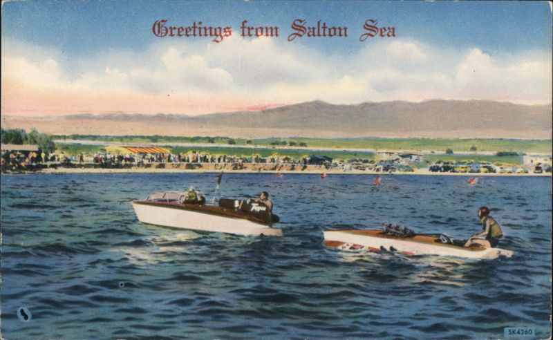 | Two speedboats cruise the waters of the Salton Sea, located near Indio, California. The shoreline in the background is dotted with spectators and vehicles. This large body of water, formed by an overflow of the Colorado River, is noted as a popular destination for boating, swimming, and fishing. |