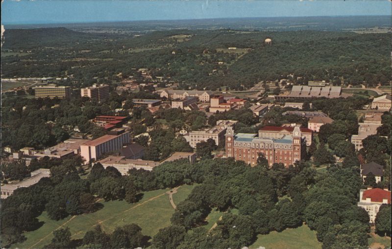 UAR-40 UNIVERSITY OF ARKANSAS FAYETTEVILLE, ARKANSAS Air-view by Bob Wyer, Delhi, N. Y. All rights reserved. 3201-C Pub. by Bob Wyer Photo Cards, Delhi, N. Y. HERE