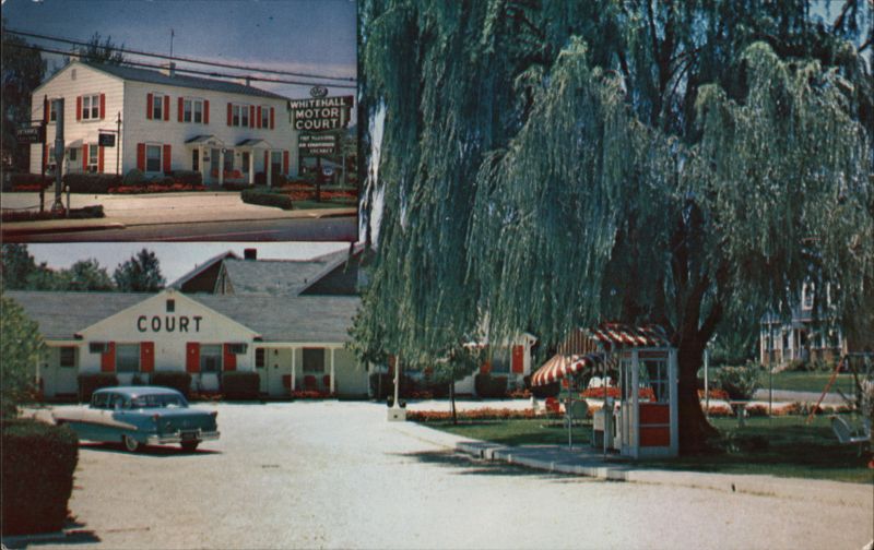 Composite view of the Whitehall Motor Court. The top inset shows the two-story main building. The larger view shows the single-story court units, a vintage blue car, and a prominent weeping willow tree. The motel advertised air-conditioning and free room TV. |
