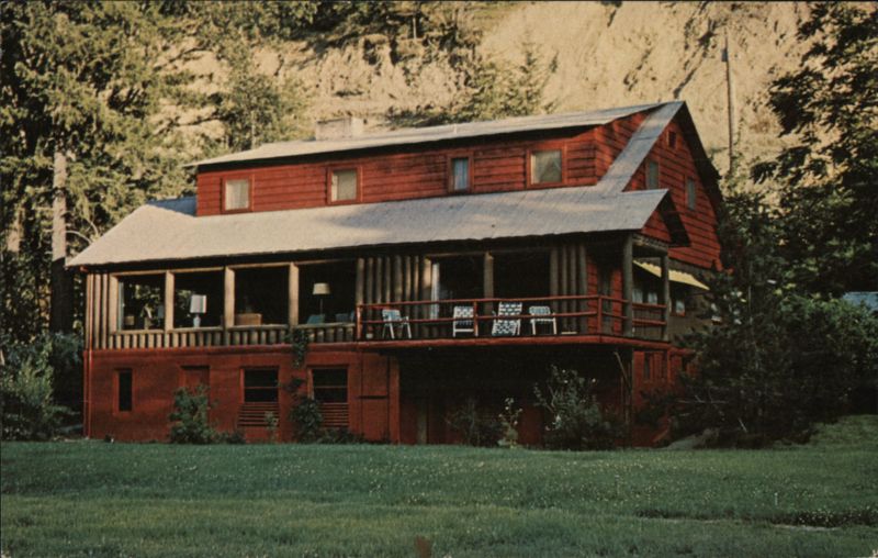 Red wooden lodge with a grey roof, surrounded by trees and a grassy lawn. Features a porch with outdoor furniture. Located on the Rogue River, offering deluxe accommodations, fine food, guided Steelhead trips, and Rubber Raft White Water trips. |