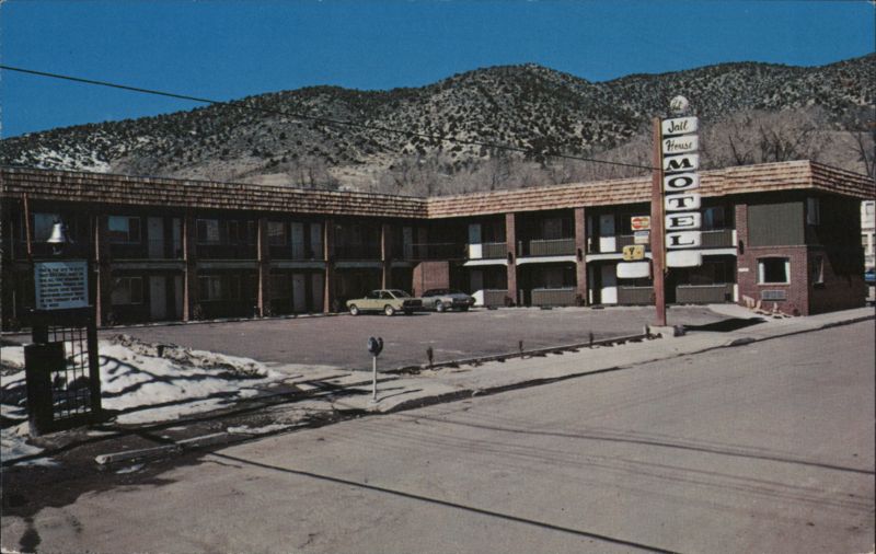 | Exterior of the Jail House Motel in Ely, Nevada, built on the site of Ely's first Jailhouse. The motel offered Color TV, Direct Dial Phones, Air-Conditioning, and Queen Size beds. Cars are visible in the parking lot with a mountain in the background. |