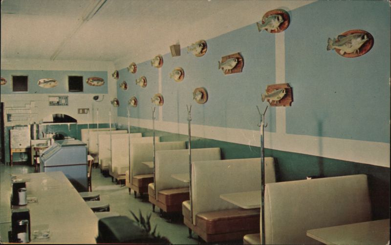 ANGLERS CAFE Mt. Home, Arkansas. Displaying the area's largest collection of Lunker Bass and Trout. SC8866 Natural Color Card. Kobert Color Publishers, Doniphan, Mo.