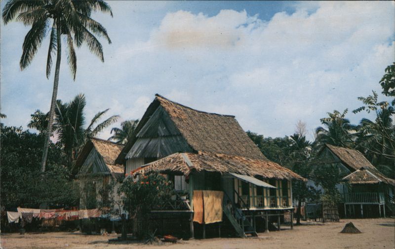 A Malay Kampong SINGAPORE Picture shows houses made of wooden planks and cov- ered with attap leaves. These are cool and comfortable homes to the poorer classes although lacking many mod- ern conveniences. S252 13044 malayan Color Views HERE