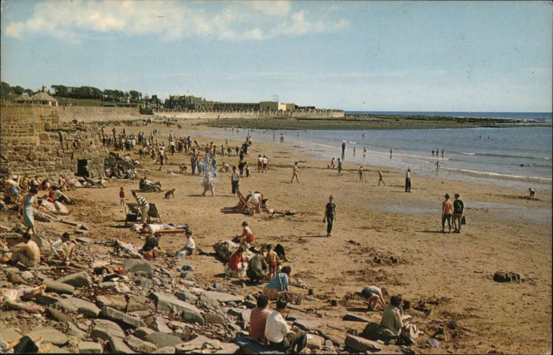 A bustling summer day at The Beach in Arbroath, with numerous people relaxing, sunbathing, and walking along the sandy and rocky shore. A stone seawall and buildings are visible in the background, under a partly cloudy sky.