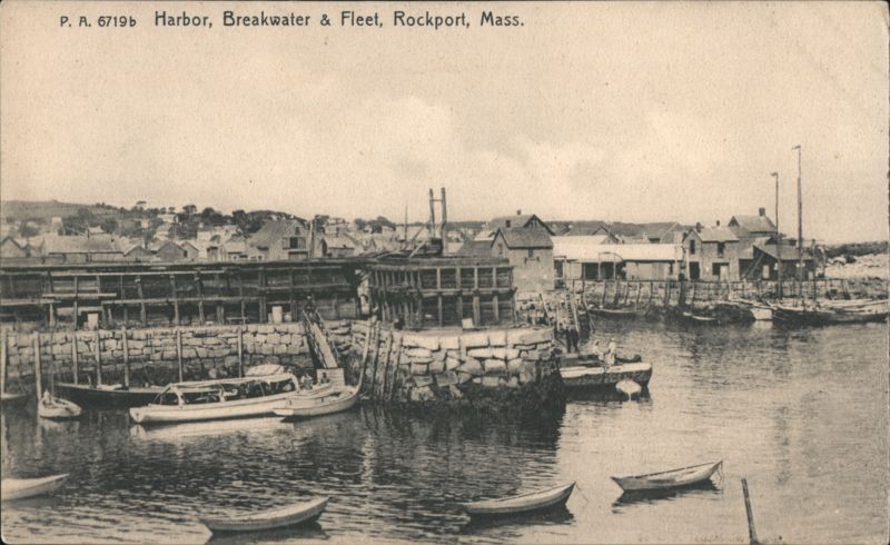 View of Rockport harbor, featuring a stone breakwater, numerous boats including smaller rowboats and larger vessels, with buildings lining the waterfront.