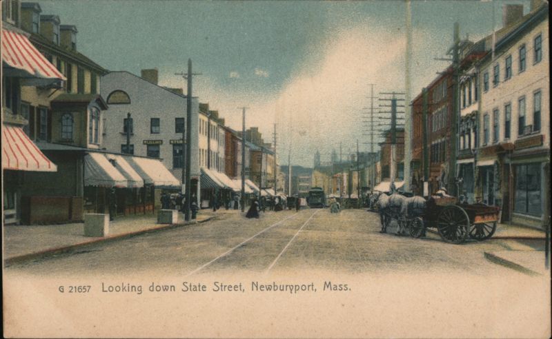 | Street view of State Street in Newburyport, Massachusetts, showing a horse-drawn carriage on the right, trolley tracks running down the center of the street, and buildings with awnings on both sides. A trolley car is visible in the distance. Utility poles line the street. |