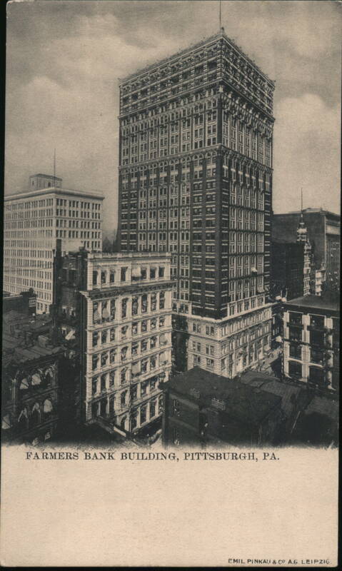 Elevated view of the multi-story Farmers Bank Building and surrounding architecture in Pittsburgh.