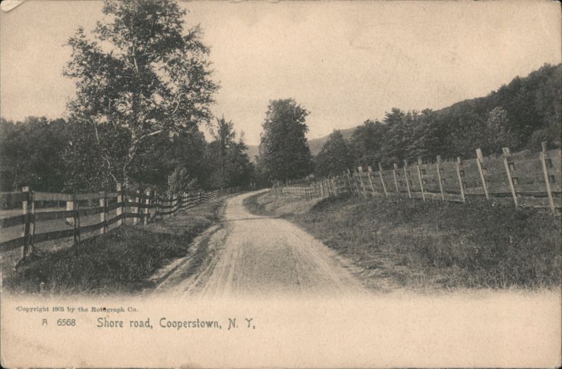 A dirt road, identified as Shore Road, winds through a rural landscape. The road is lined with wooden fences and mature trees, with hills visible in the distance.