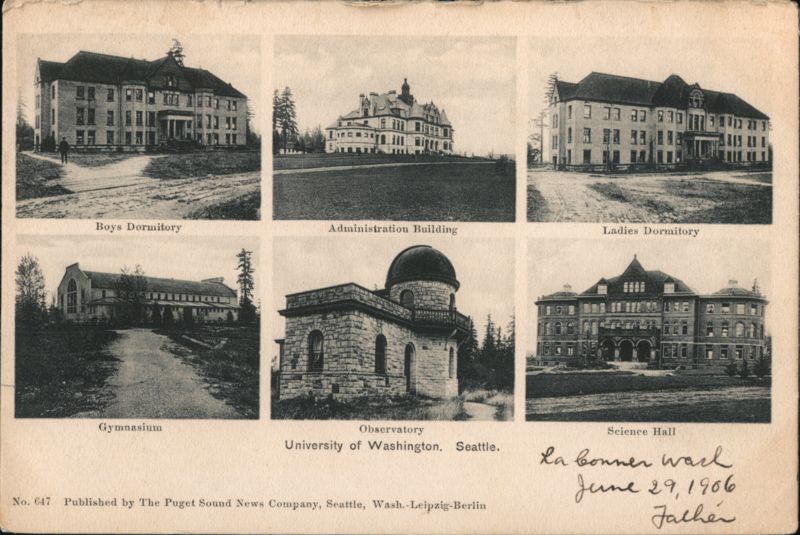 Six views of University of Washington buildings: Boys Dormitory, Administration Building, Ladies Dormitory, Gymnasium, Observatory, and Science Hall.