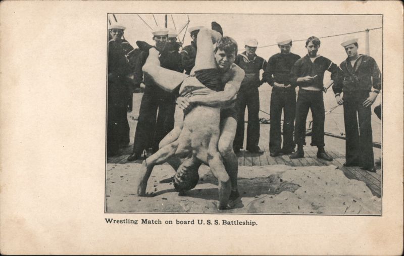 Two men engage in a wrestling match on the deck of a U.S.S. Battleship, with several sailors in uniform observing.