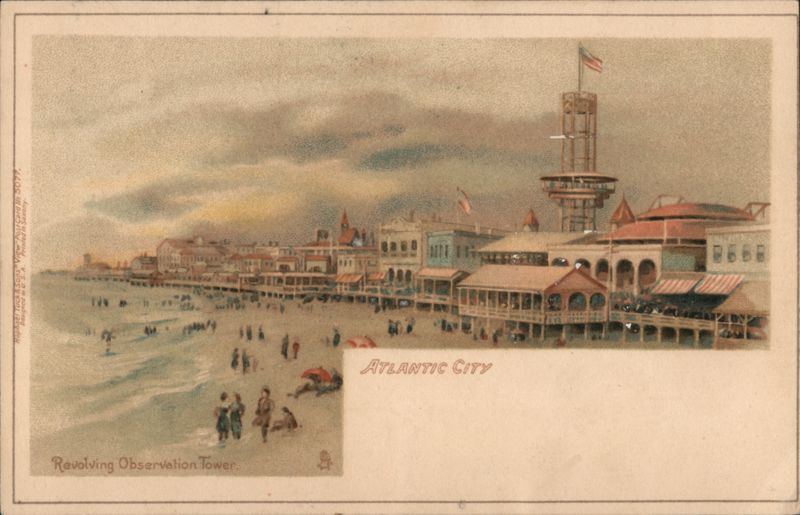 | View of the Atlantic City, NJ shoreline, featuring the beach with people and umbrellas, waves, the boardwalk, numerous large buildings (likely hotels and businesses), and the prominent Revolving Observation Tower flying an American flag. The scene is under a cloudy sky. |