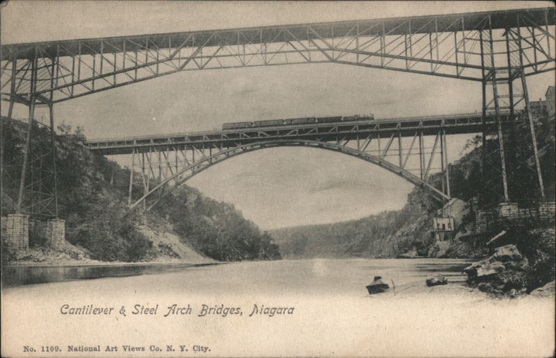 | A sweeping view of the Cantilever Bridge and the Steel Arch Bridge arching gracefully across the Niagara River gorge. A passenger train traverses the upper Cantilever Bridge. The steep, rocky banks of the gorge are covered in trees, and a lone small boat navigates the waters below. |