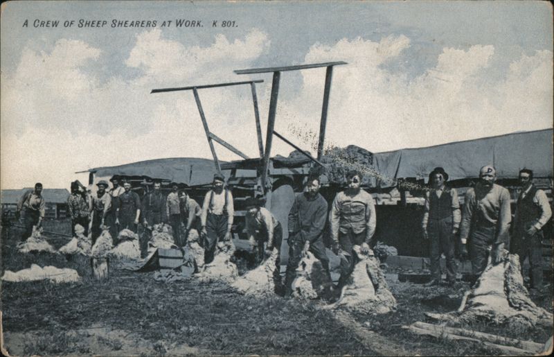 A group of approximately twelve men posing amidst freshly shorn sheep and large piles of wool. In the background, a wooden shearing structure and a covered wagon or tent are visible under a partly cloudy sky.