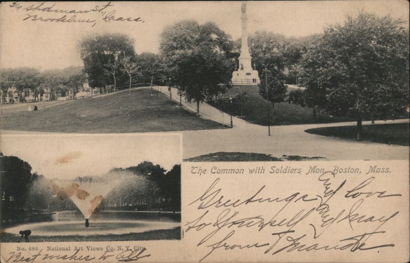 View of The Common in Boston, Massachusetts, featuring the Soldiers' and Sailors' Monument. A smaller inset image displays a fountain in a park.