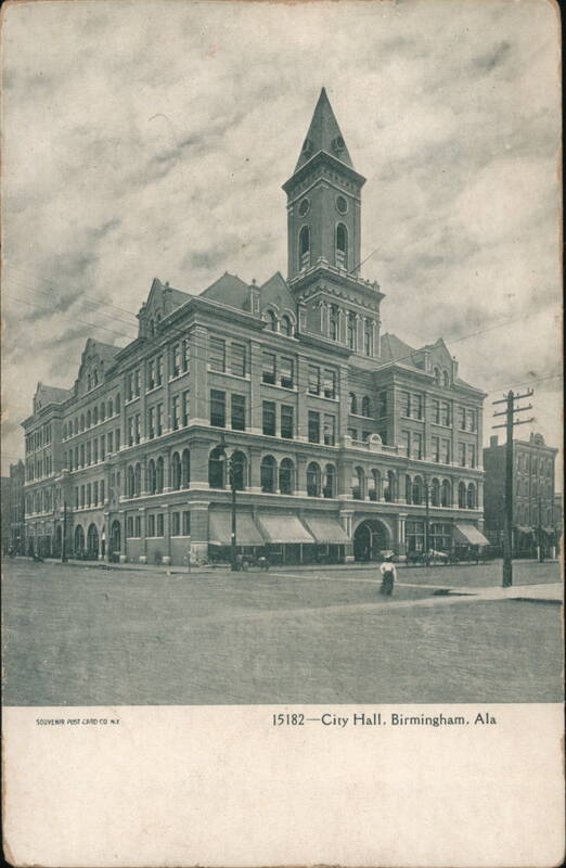 Exterior view of the Birmingham City Hall, a multi-story building with a prominent clock tower. People and horse-drawn carriages are visible on the street in front of the building.