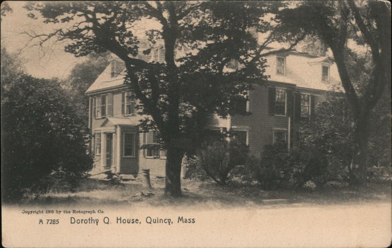 The Dorothy Q. House, a two-and-a-half-story wooden clapboard residence with multiple dormer windows, viewed through large, mature trees in the foreground.